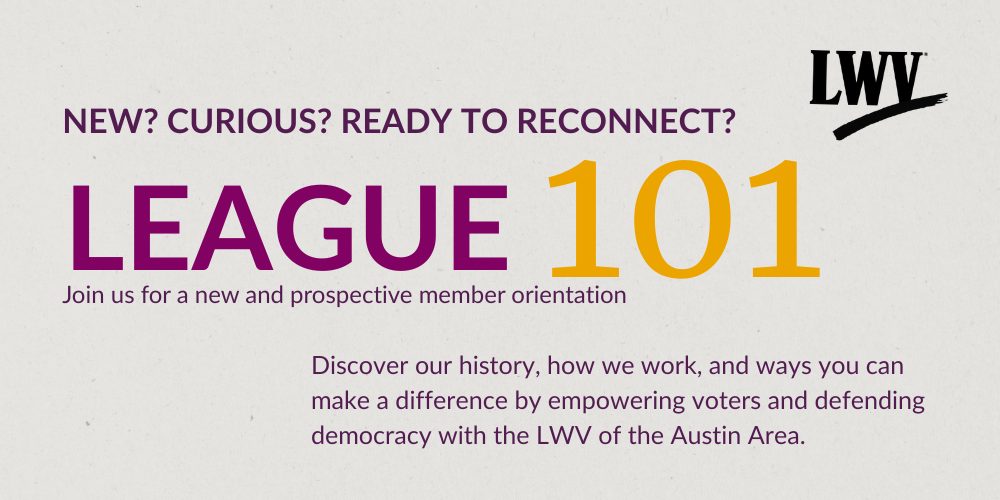 You'll learn a bit about the history of the League of Women Voters and about how the Austin Area League is organized. You'll meet other new and prospective members and hear from veteran League volunteers about opportunities to use your time and talents with the League.